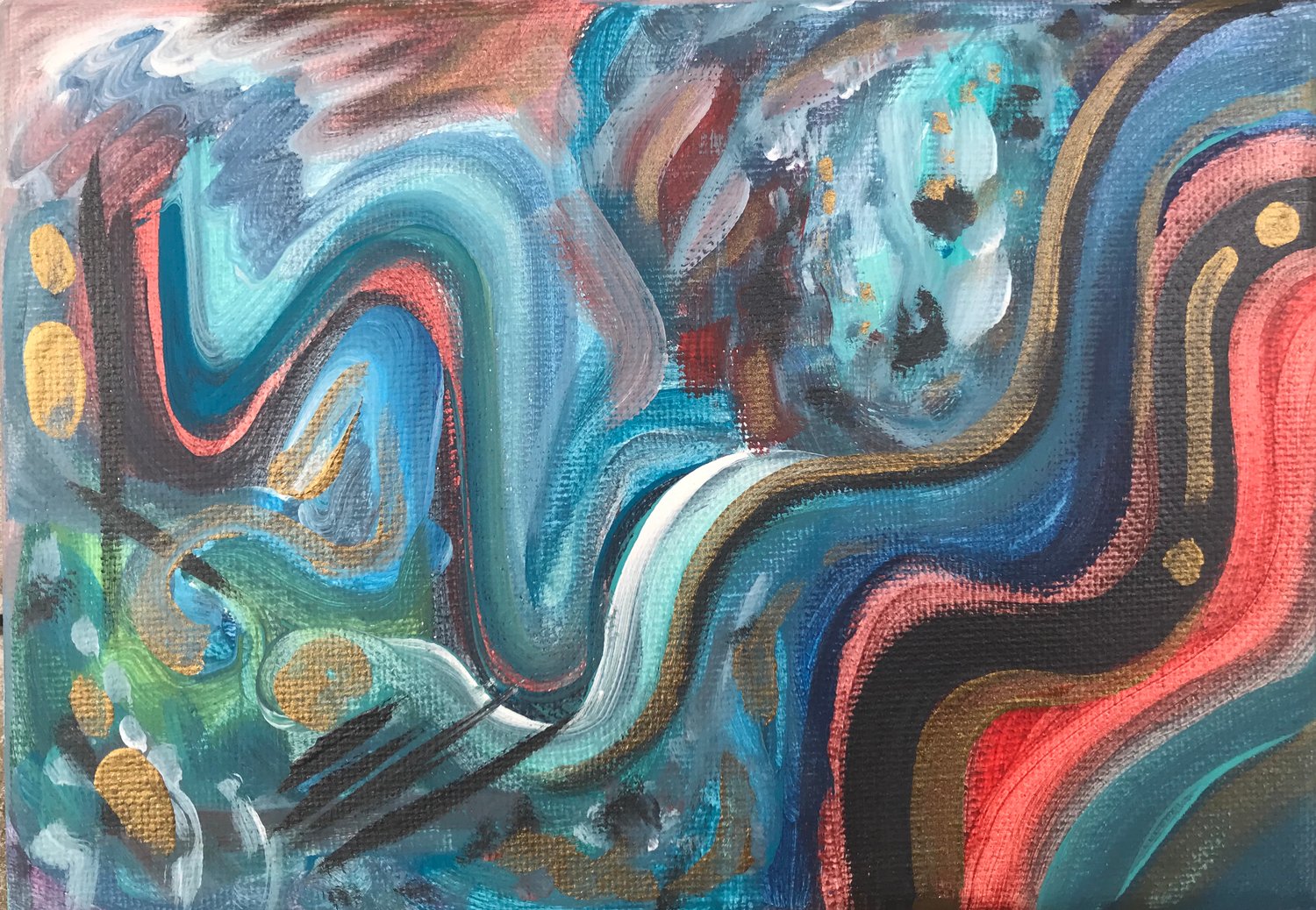 A synesthesia painting of the new hit song, “I Think Therefore I Am” by Billie Eilish. Acrylic on 5x7” canvas.